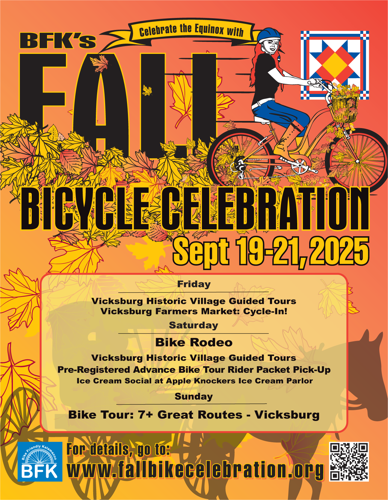 The Fall Bike Celebration is organized by Bike Friendly Kalamazoo (BFK), a 501(c)3 non-profit network of volunteers working to make our greater community even more bike friendly (see our About page).